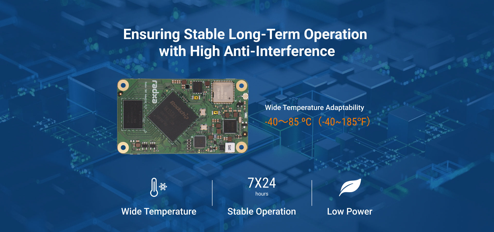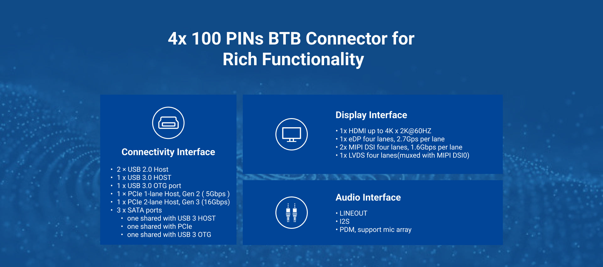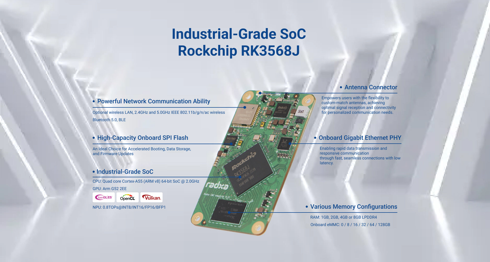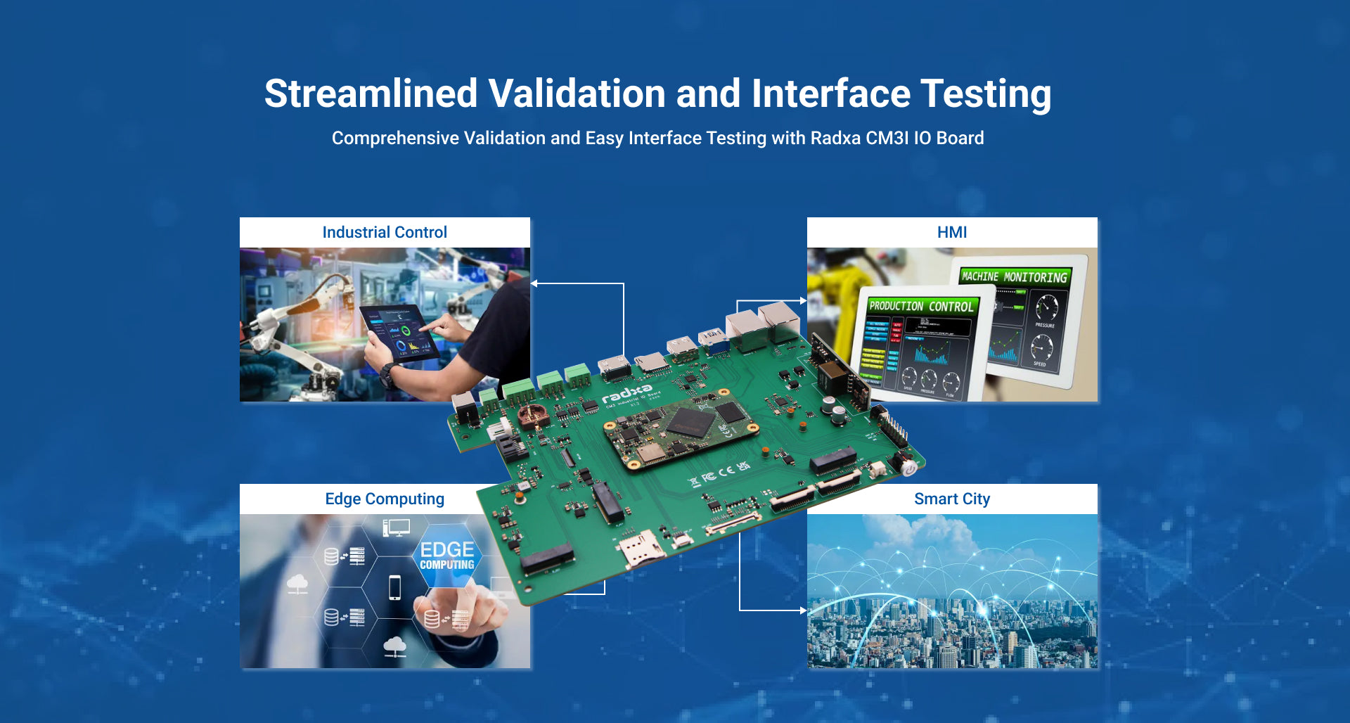 The Radxa CM3I accelerates the customer's product development by providing a powerful SoM in a very small form factor. The customer can quickly put the prototype into production by developing a simple carrier board.
